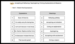 Dosya, “Accepting & Refusing, Apologizing, Giving Explanations and Reasons” başlıkları altında etkinlikler sunmaktadır.
