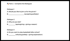 Öğrencilerden eşleştirme, diyalog tamamlama, rol yapma, yaratıcı diyalog yazma ve eğlenceli kart oyunları gibi etkinlikleri yapmaları beklenir.